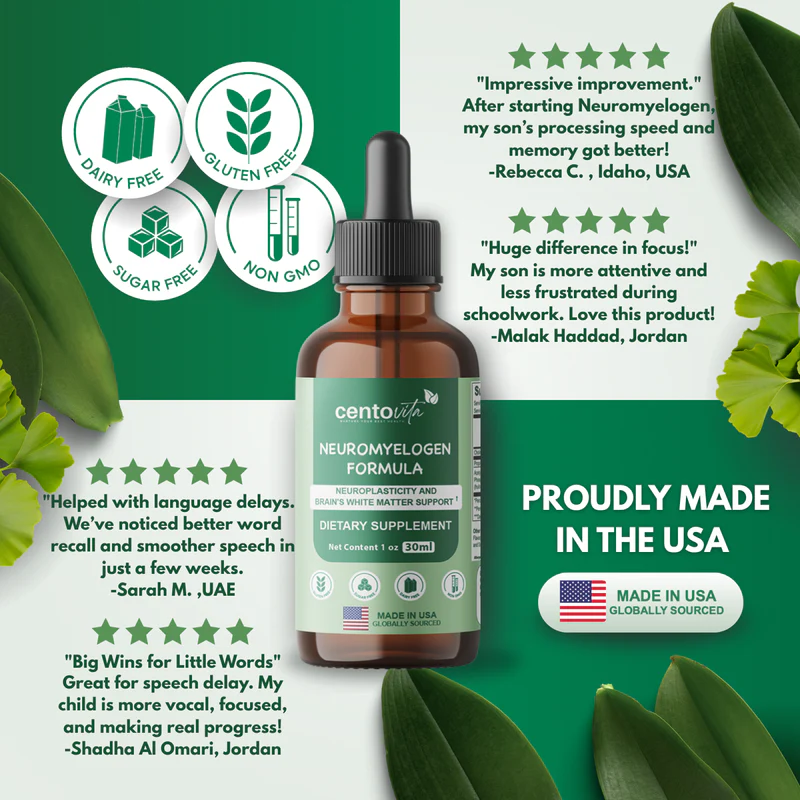 Neuromyelogen Formula: Neuroplasticity and Brain's White Matter Health Support for Children is a targeted liquid supplement scientifically formulated to support the development and maintenance of white matter and myelin sheaths—key components in neural signaling and cognitive efficiency. These structures are often underdeveloped or functionally delayed in children with Autism Spectrum Disorder (ASD), contributing to difficulties in language, sensory integration, attention, and emotional regulation. By promoting healthy myelination and synaptic plasticity, the formula aims to accelerate the maturation of brain connectivity pathways that are typically delayed in autistic children. Neuromyelogen works at the core of neurological development by: Supporting the repair and regeneration of myelin sheaths damaged by oxidative stress, inflammation, or metabolic imbalance often seen in ASD. Enhancing information processing speed, memory, and adaptive learning, areas that are commonly impaired in children on the spectrum. Contributing to calmer behavior, improved attention span, and more efficient communication between brain regions, which may positively influence behavioral and cognitive outcomes. By helping reverse acquired features of neurodevelopmental delays and strengthening the foundational pathways involved in cognition and communication, Neuromyelogen serves as a supportive adjunct in autism care. Delivered in a child-friendly 30 ml bottle with a precision dropper, this daily-use supplement integrates easily into therapeutic routines aimed at optimizing brain development.