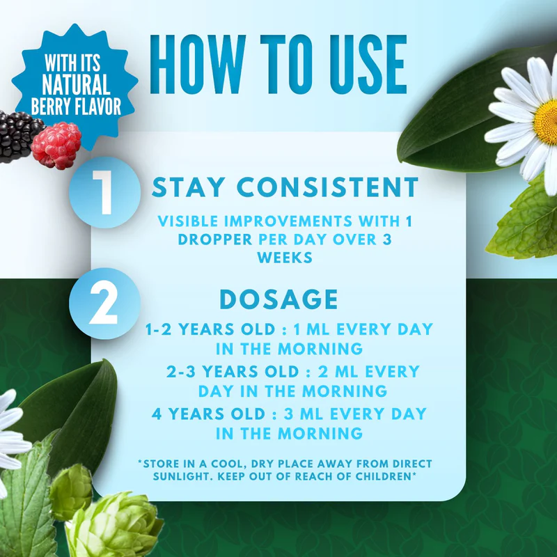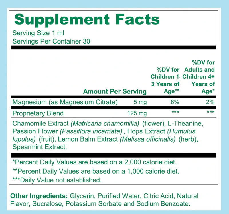 This gentle, child-safe liquid formula is designed to promote a calm, focused, and balanced mood. It features a proprietary blend of calming botanicals and minerals, including magnesium citrate, L-theanine, chamomile, lemon balm, passionflower, hops, spearmint, and organic herbal extracts. Together, these ingredients support relaxation, emotional regulation, and mental clarity without causing drowsiness. Naturally flavored with berry and formulated with safe preservatives, this supplement is ideal for children needing gentle mood support in a smooth and pleasant-tasting 1 ml daily serving.