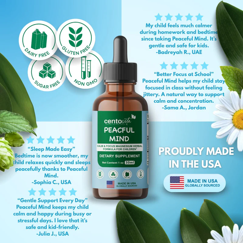 Peaceful Minds: Calm & Focus Magnesium Herbal Formula for Children is a thoughtfully crafted liquid supplement designed to promote natural relaxation, mental focus, and emotional balance in children aged 1 year and older. This formula is ideal for children experiencing hyperactivity, attention difficulties, restlessness, anxiety, or sensory processing challenges—especially those with ADHD, ASD, or stress-related behaviors. At the core of Peaceful Minds is Magnesium Citrate, a highly bioavailable form of magnesium that supports neurotransmitter regulation and the reduction of excitatory signals in the brain. Magnesium deficiency is commonly associated with increased irritability, sleep disturbances, and poor focus in children, making it a key nutrient for emotional regulation and neural stability. To enhance its calming effect, the formula includes a synergistic blend of clinically recognized botanical extracts. By targeting neurotransmitter balance, stress response, and central nervous system regulation, Peaceful Minds offers a natural and non-addictive alternative to pharmacological interventions commonly used in ADHD management. It supports improved concentration, emotional stability, and social behavior, making it especially beneficial during school hours, therapy sessions, or transitions that require extra focus and composure. With its pleasant berry flavor and alcohol-free, child-safe formula, Peaceful Minds is easy to administer and well-tolerated. Packaged in a 30 ml bottle with a dropper for accurate dosing, it is ideal for daily use on an empty stomachor as advised by your child’s healthcare provider. Whether used alone or as part of a broader neurodevelopmental protocol, Peaceful Minds supports your child’s calm clarity and emotional growth—naturally and effectively. Recommended Dosage: 1-2 years old : 0.5 ml twice daily (morning and night) 2-3 years old :1 ml twice daily (morning and night) 4 years old : 2 ml twice daily (morning and night)