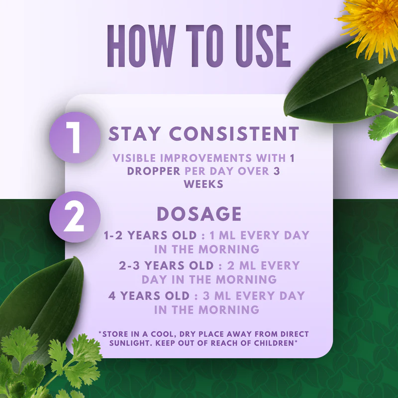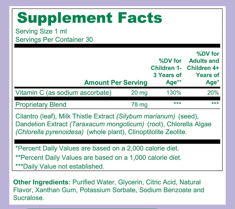 This detox-focused liquid supplement is specially formulated to support gentle cleansing and overall wellness in children. It features a proprietary blend of natural ingredients known for their detoxifying and antioxidant properties, including organic cilantro, chlorella, zeolite, milk thistle, dandelion root, and vitamin C. Together, these ingredients help promote the body’s natural elimination of environmental toxins, support liver function, and strengthen the immune system. Delivered in a smooth, easy-to-take 1 ml daily dose, this formula offers a safe and effective way to support internal balance and detox pathways in growing children.